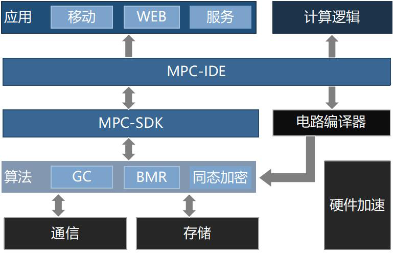 针对计算逻辑提供者,MPC-IDE实现计算逻辑的编写,并通过集成的电路编译器转化为电路文件;作为数据执行方,矩阵元提供的MPC-SDK直接为计算逻辑提供者服务;并且矩阵元对MPC-SDK内部算法实现GPU、FPGA等硬件加速,使协同计算过程更快地完成。