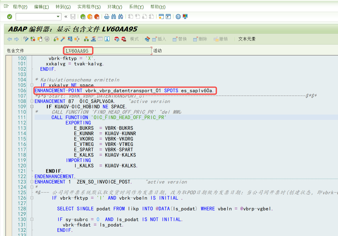 *&--- 公司间开票系统默认取交货时间作为发票日期,改为取POD日期做为发票日期:当公司间开票时(创建状态,即vbrk-vbeln还未生成),取POD日期做为开票日期 IF vbrk-fktyp = 'I' AND vbrk-vbeln IS INITIAL . SELECT SINGLE podat FROM likp INTO @DATA(ls_podat) WHERE vbeln = @vbrp-vgbel. IF sy-subrc = 0 AND ls_podat IS NOT INITIAL. vbrk-fkdat = ls_podat. ENDIF. ENDIF. *&--- 当公司间销售开票时,取凭证货币替代客户主数据货币做为公司间开票货币 IF vbrk-fktyp = 'I'. IF vbrp-aubel IS NOT INITIAL AND vbrp-auref = 'X'. SELECT SINGLE waers FROM ekko INTO @DATA(lv_waers) WHERE ebeln = @vbrp-aubel. IF sy-subrc = 0. IF lv_waers NE vbrk-waerk. vbrk-waerk = lv_waers. ENDIF. IF lv_waers NE kuagv-waerk. kuagv-waerk = lv_waers. ENDIF. ENDIF. ENDIF. ENDIF.
