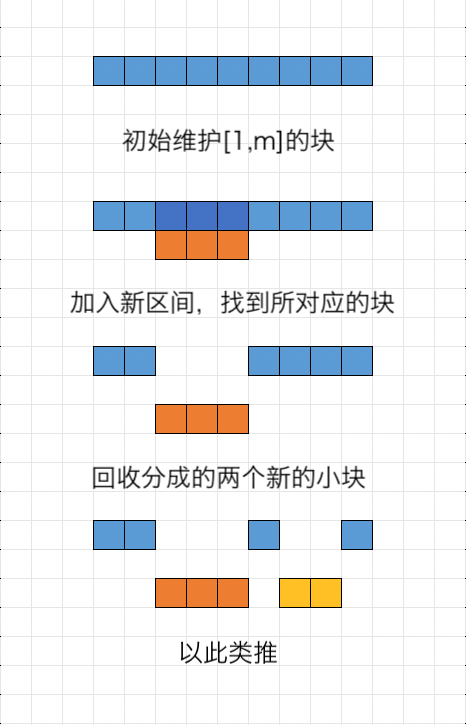 问题来了,要怎么维护“块”呢?方法有很多,这里介绍一种用 set 维护的方法。(类似 ODT 的思想,但是为了找相交的块所以用的 operator< 不一样)