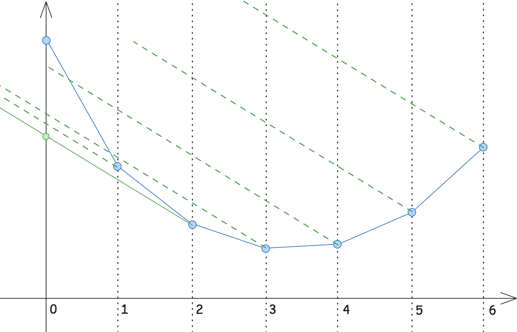 然后我们发现那个与 \(y\) 轴交点最低的直线所属的点就是这个斜率属于的 \(x\)。