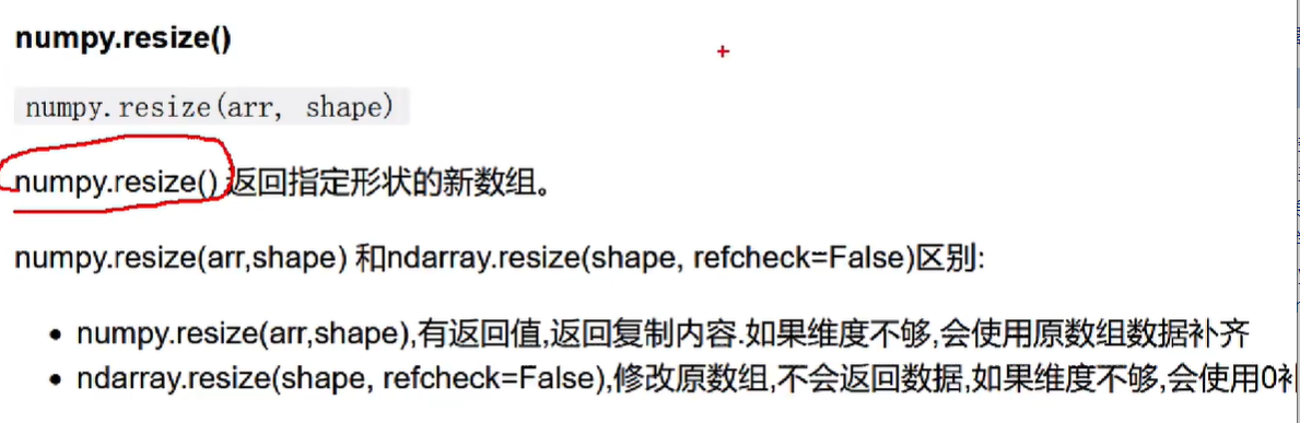 两种方式:np.resize(数组名,维度) 不够的话用原数组的值填充 数组名.resize(维度,refcheck=False)refcheck是必填的,等于false,不够的用0填充