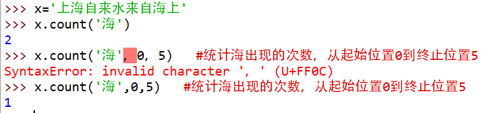 count(sub[,start[,end]]):用于查找sub参数指定的子字符串在字符串中出现的次数