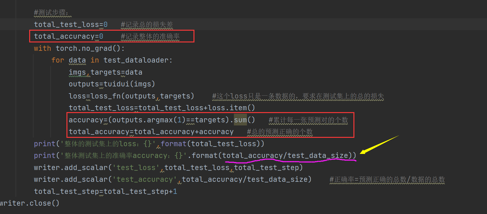 #测试步骤: total_test_loss=0 #记录总的损失差 with torch.no_grad(): for data in test_dataloader: imgs,targets=data outputs=tuidui(imgs) loss=loss_fn(outputs,targets) #这个loss只是一条数据的,要求在测试集上的总的损失 total_test_loss=total_test_loss+loss.item() print('整体的测试集上的loss:{}',format(total_test_loss))