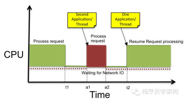 一个避免以上问题出现的方法就是为在同一个服务下运行多个应用程序。所以,当一个应用程序的线程被阻塞时,其他应用的线程可以继续使用CPU来处理其他请求。下图中有两个应用在竞争CPU的使用时间,其中第二个应用的CPU消耗时间在a1到a2之间,但是我们还是可以看到CPU在时间段a1到t1、a2到 t2之间还是空闲的。