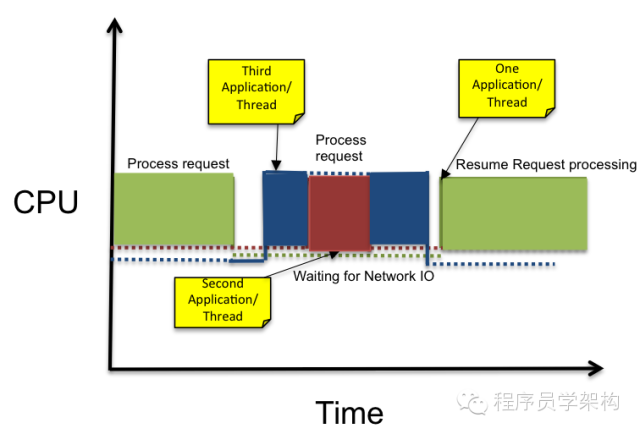为了使CPU没有任何空闲时间,我们可以再增加更多的应用,但是这会增加不必要的上下文切换进而导致性能进一步降低。如下图的例子中,第三个应用即使还在处理一个请求还需要更多CPU运行时间,但是还是会和第二个应用程序之间的线程进行切换。