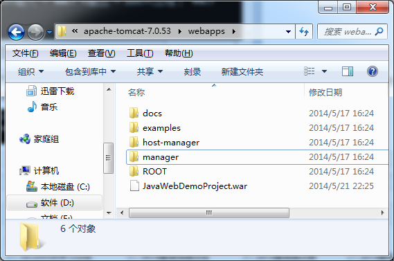 例如:把F盘下的JavaWebDemoProject这个JavaWeb应用直接copy到tomcat服务器webapps目录中,如下图所示:
