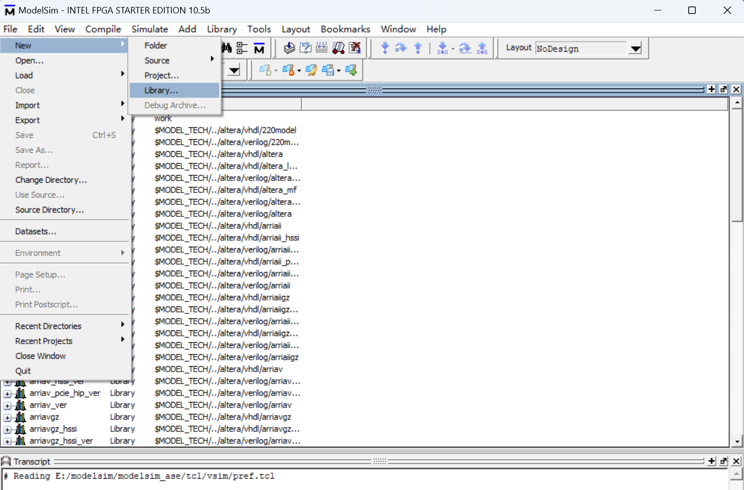 在建立工程(project)之前,一般先建立一个工作库(library),将这个工作库命名位work。首次使用ModelSim时,通过File->new->library来建立工作库work。