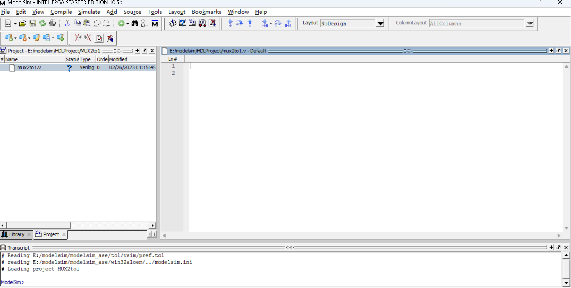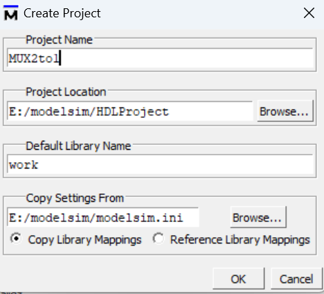 通过File->new->project来建立新工程,指定自己的项目名称,项目位置,默认的工作库等。本示例中使用一个2选1数据选择器电路作为演示,命名为MUX2to1,之后选择create new file。