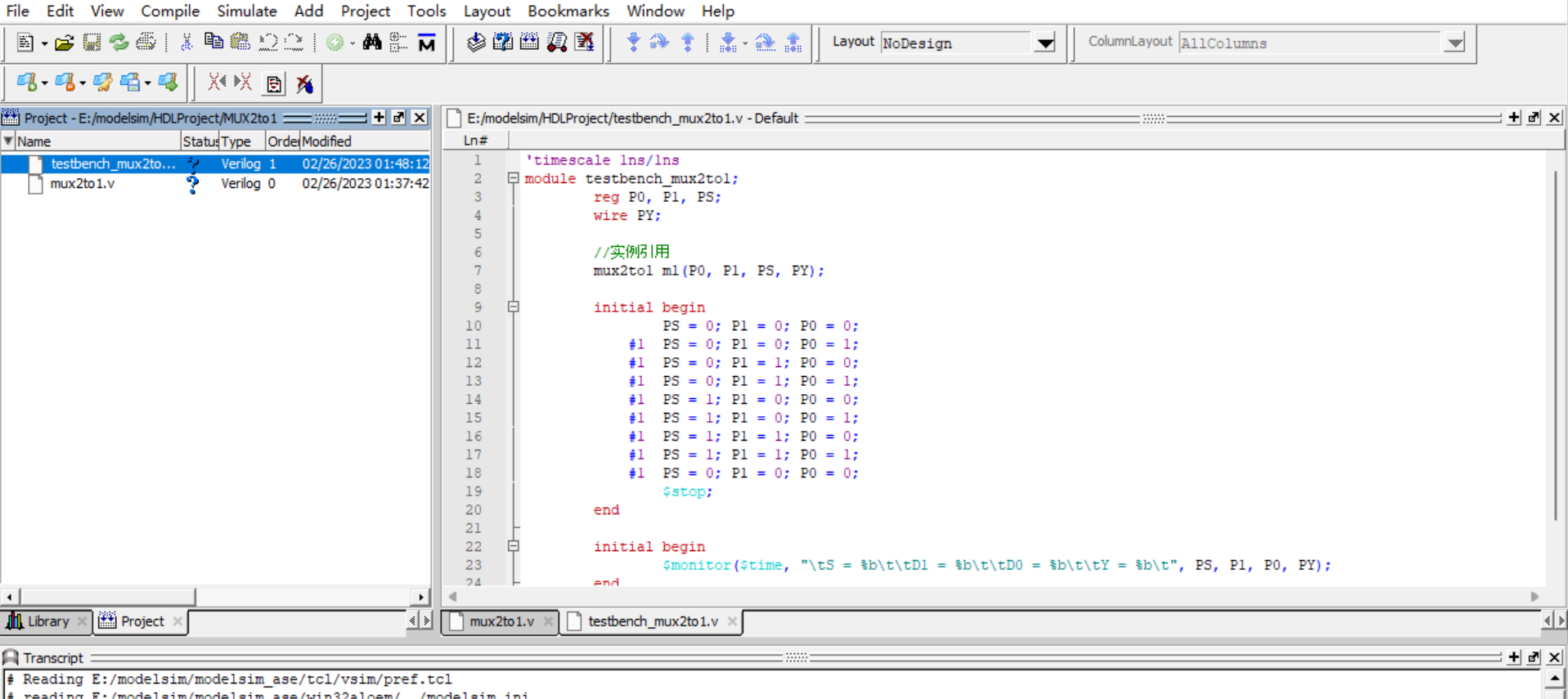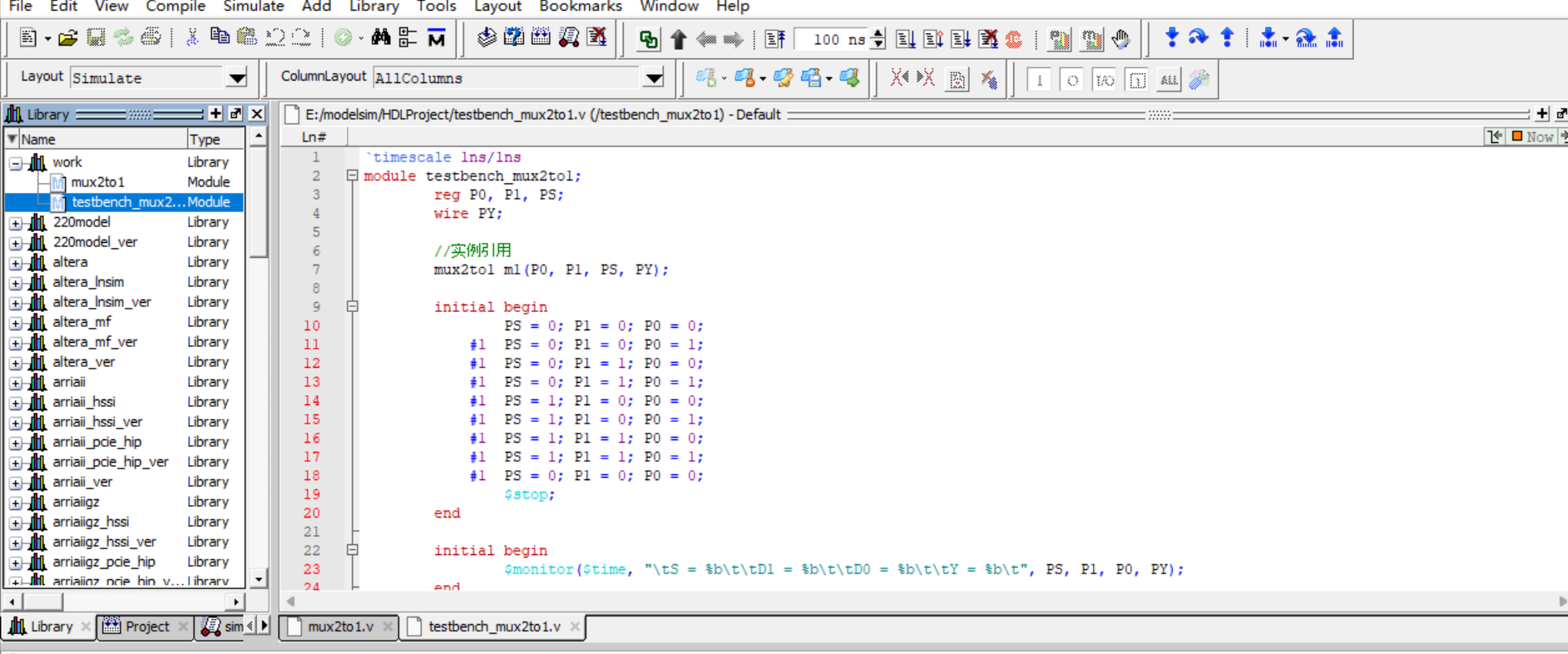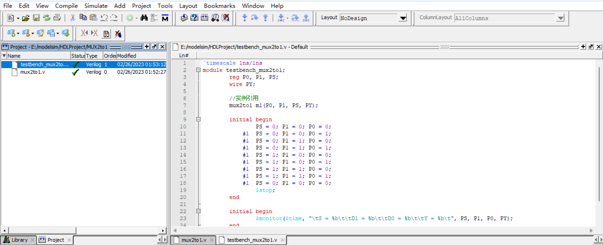 编写设计代码并且保存完成之后,保存并编写2选1数据选择器的激励模块,代码如下。