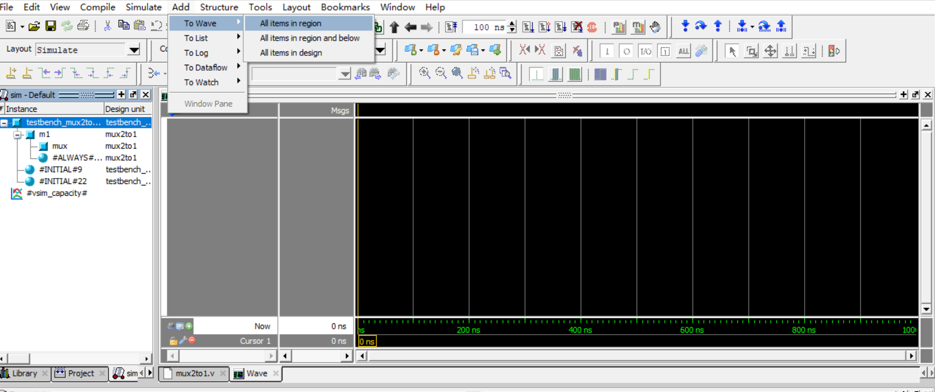 选择主菜单中Add->To Wave->All items in region,添加信号到Wave窗口。(需要选中整个文件,如图中蓝色部分)