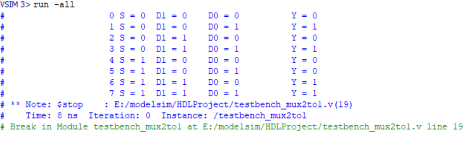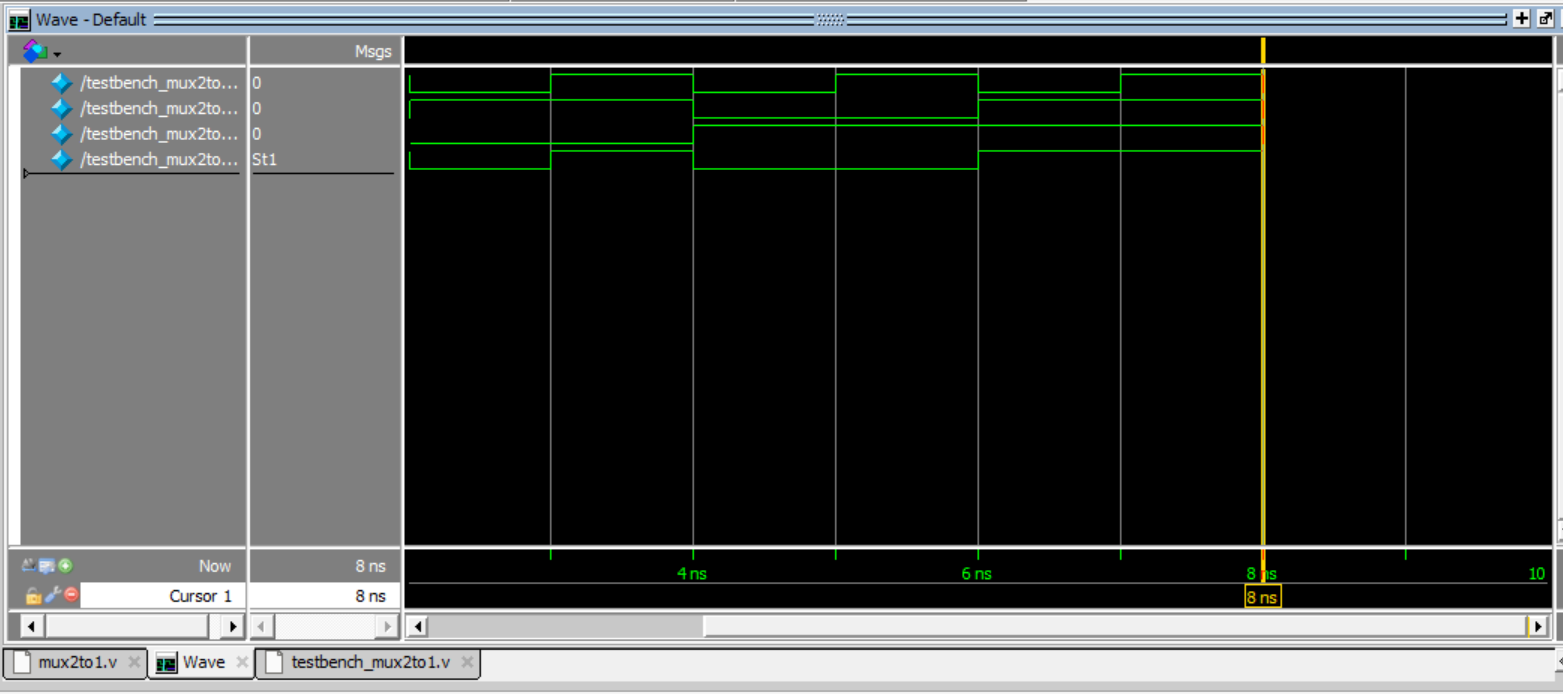 `timescale 1ns/1ns module testbench_mux2to1; reg P0, P1, PS; wire PY; //实例引用 mux2to1 m1(P0, P1, PS, PY); initial begin PS = 0; P1 = 0; P0 = 0; #1 PS = 0; P1 = 0; P0 = 1; #1 PS = 0; P1 = 1; P0 = 0; #1 PS = 0; P1 = 1; P0 = 1; #1 PS = 1; P1 = 0; P0 = 0; #1 PS = 1; P1 = 0; P0 = 1; #1 PS = 1; P1 = 1; P0 = 0; #1 PS = 1; P1 = 1; P0 = 1; #1 PS = 0; P1 = 0; P0 = 0; $stop; end initial begin $monitor($time, "\tS = %b\t\tD1 = %b\t\tD0 = %b\t\tY = %b\t", PS, P1, P0, PY); end endmodule