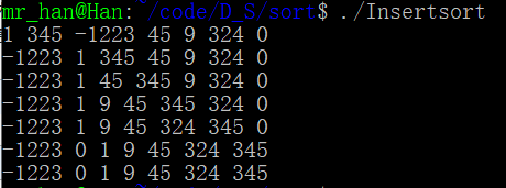 -1223 1 345 45 9 324 0 //-1223进入表以后被放在第一位,后两个元素往后移,这时候前三个元素构成有序表