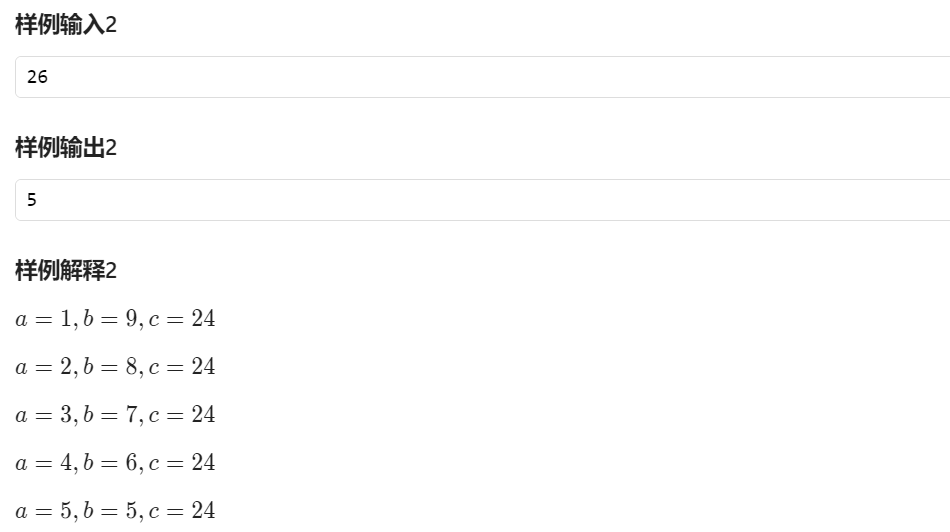 现在,蒜头君和花椰妹的木棍组成一条直角边 a + ba+b,白菜君组成另外一条直角边 cc,并且要求 a + b \leq ca+b≤c。请问一共可以有多少种取木棍的方案。