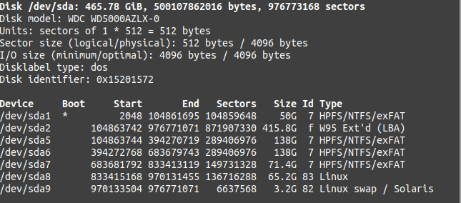 查看要挂在的WindowsNTFS分区,我的是 /dev/sda5与 /dev/sda6,分别是D盘和E盘,