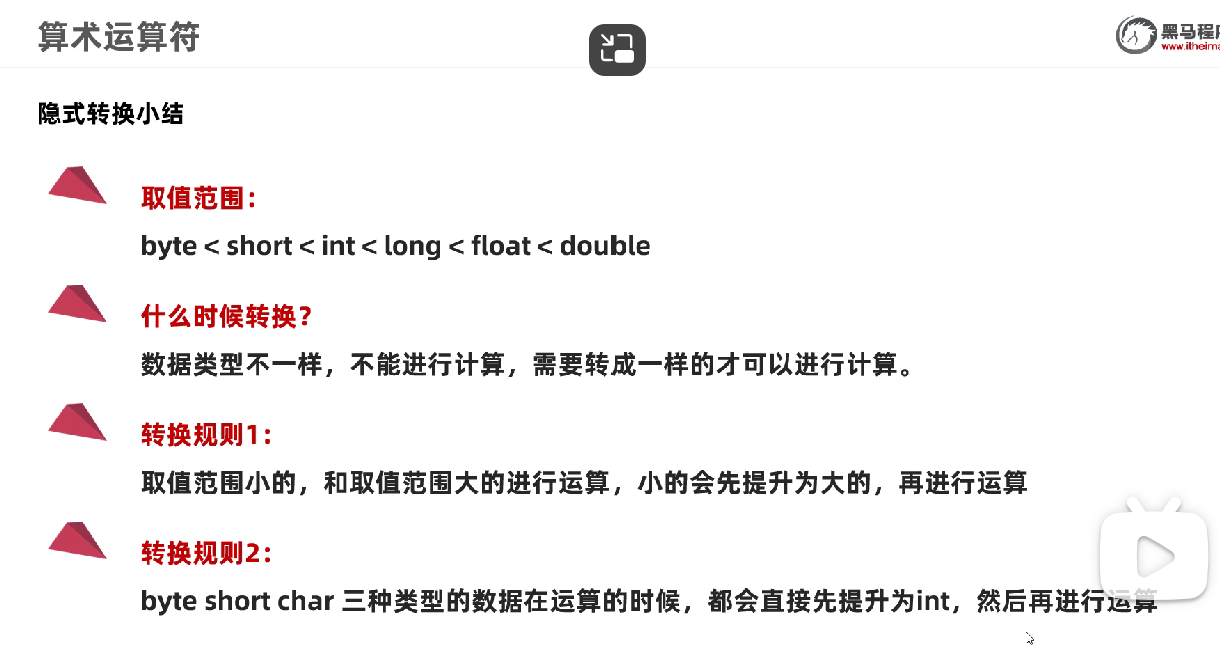 - 数字进行运算时,数据类型不一样不能运算,需要转成一样的,才能运算。