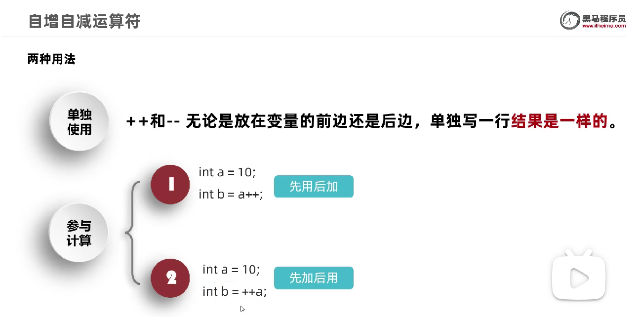 int y = x++;---先将x赋值给y, 此时y = x,在对x执行自增,x=x+1