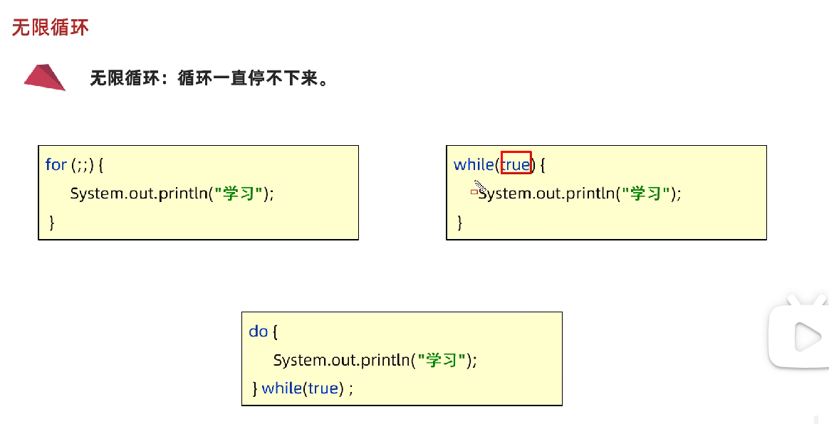 无限循环下面不能写其它代码;因为循环永远停不下来,那么下面的代码永远执行不到。