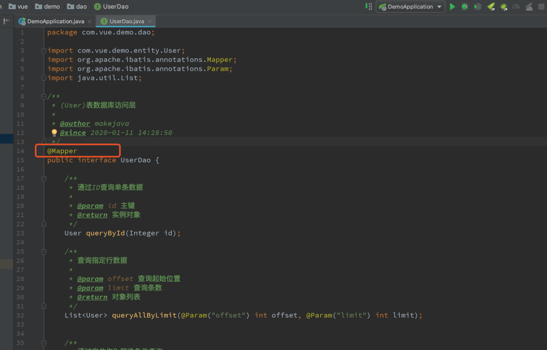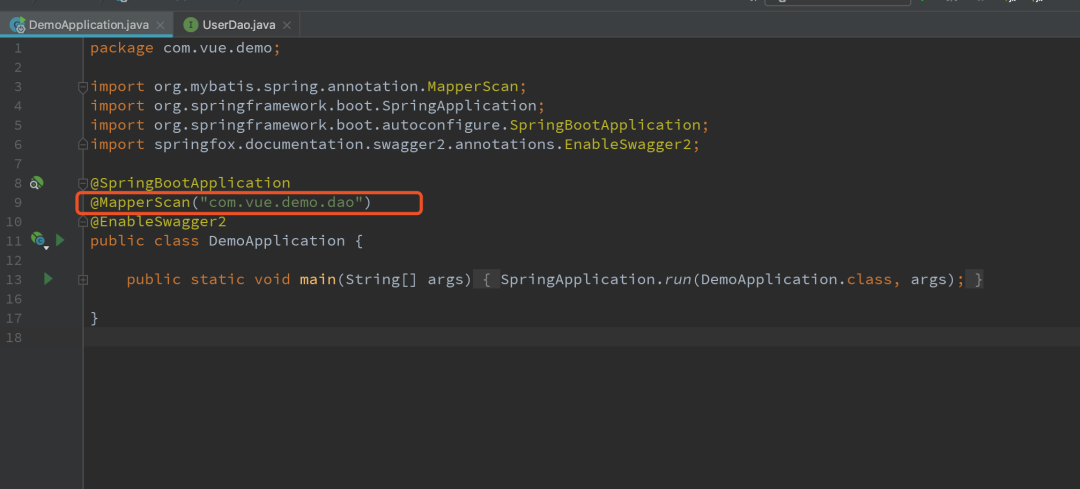 在启动类里面加上 @MapperScan("com.vue.demo.dao") 注解。