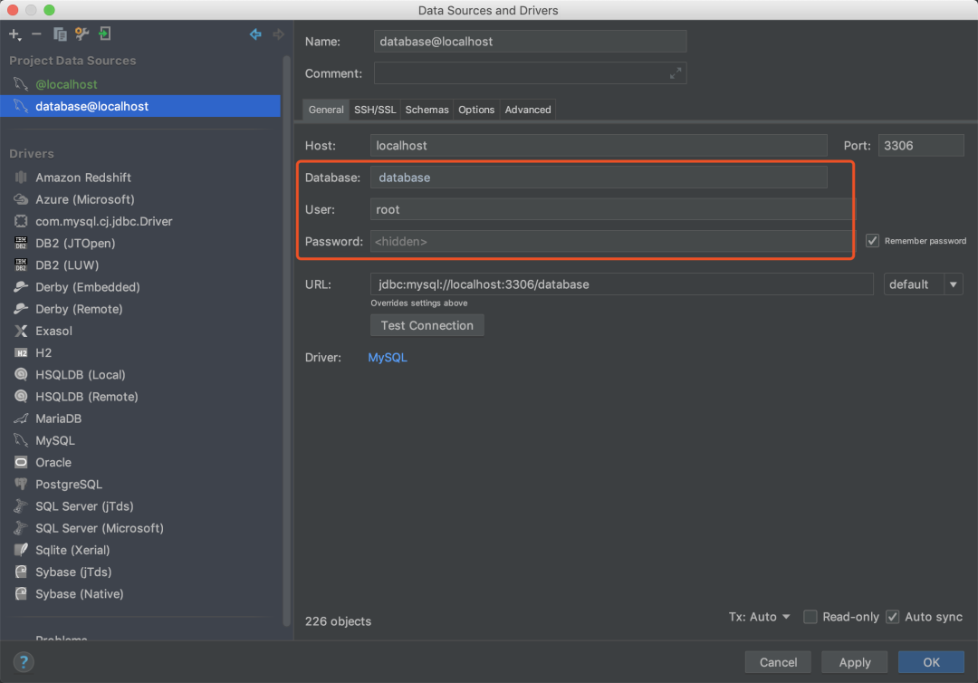 然后填写数据库名字,用户名,密码。点击 OK 即可。这样的话,IDEA 连接数据库就完事了。