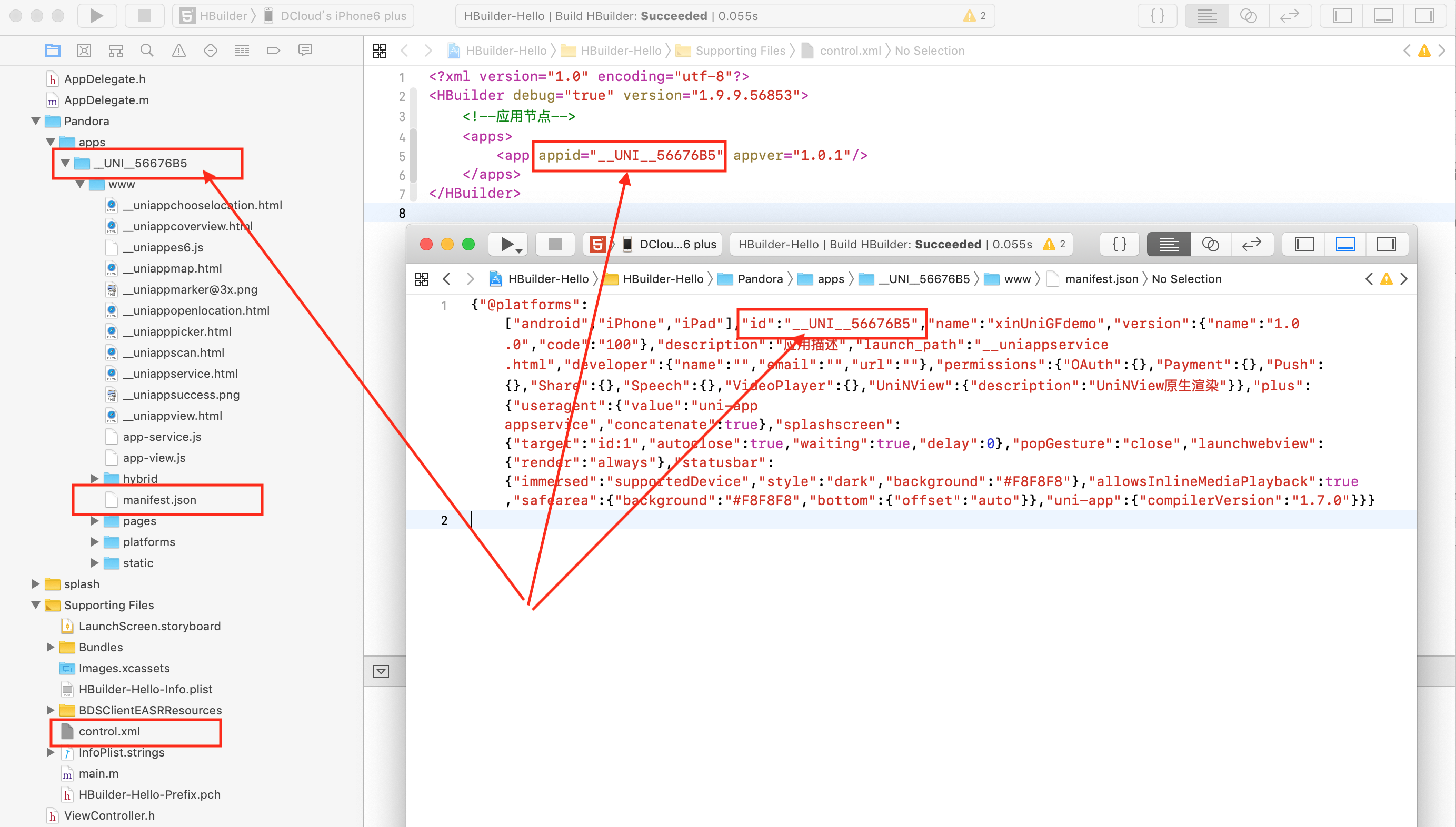 2 将HBuilder生成的app静态打包资源 copy到SDK下面文件夹中 Pandora -> apps,然后修改应用appid的值(找到control文件,修改appid的值):
