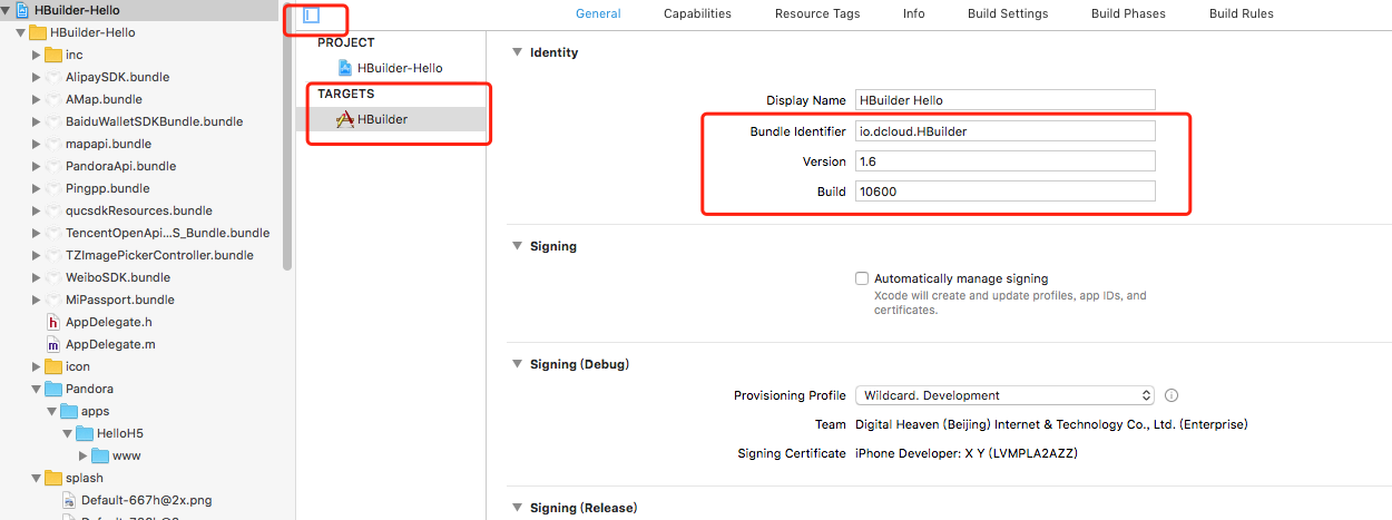 2 具体应用信息的配置:选择左侧根目录,选择TARGETS下的HBuilder打开工程属性界面,在General下的Indentify的值。