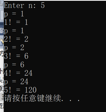 #include <stdio.h> #include<stdlib.h> long long fac(int n); // 函数声明 int main() { int i, n; printf("Enter n: "); scanf("%d", &n); for (i = 1; i <= n; ++i) printf("%d! = %lld\n", i, fac(i)); system("pause"); return 0; } // 函数定义 long long fac(int n) { static long long p = 1; printf("p = %lld\n", p); p = p * n; return p;}