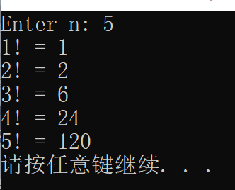 #include <stdio.h> #include<stdlib.h> long long fac(int n); // 函数声明 int main() { int i, n; printf("Enter n: "); scanf("%d", &n); for (i = 1; i <= n; ++i) printf("%d! = %lld\n", i, fac(i)); system("pause"); return 0; } // 函数定义 long long fac(int n) { static long long p = 1; p = p * n; return p;}