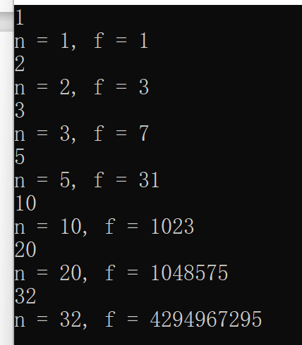 #include <stdio.h> long long func(int n); // 函数声明 int main() { int n; long long f; while (scanf("%d", &n) != EOF) { f = func(n); // 函数调用 printf("n = %d, f = %lld\n", n, f); } return 0;} long long func(int n) { long long a; if(n==0) a=0; else a=(func(n-1)+1)*2-1; return a; }