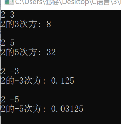 #include <stdio.h> double mypow(int x, int y); // 函数声明 int main() { int x, y; double ans; while(scanf("%d%d", &x, &y) != EOF) { ans = mypow(x, y); // 函数调用 printf("%d的%d次方: %g\n\n", x, y, ans); } return 0; } double mypow(int x,int y) { double ans=1.0; double t,m; if(y>0) m=y; if(y<0) m=-y; int i; for(i=0;i<m;i++) if(y>=0) ans*=x; else {t=x; ans*=1/t;} return ans; }