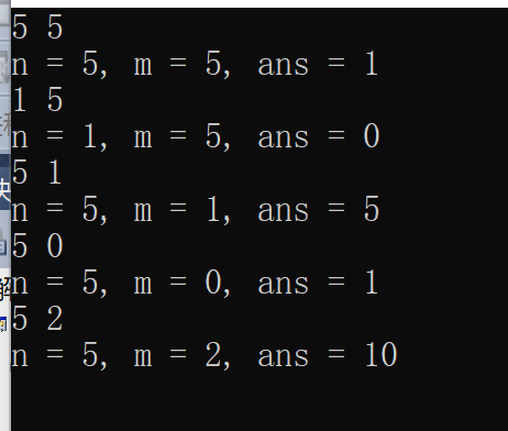 #include <stdio.h> int func(int n, int m); int main() { int n, m; while(scanf("%d%d", &n, &m) != EOF) printf("n = %d, m = %d, ans = %d\n", n, m, func(n, m)); return 0; } int func(int n,int m) { if(n<m||n<0||m<0) return 0; if(m==0||m==n) return 1; return func(n-1,m)+func(n-1,m-1);}
