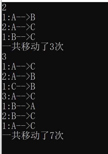 #include<stdio.h> #include<stdlib.h> void hanoi(unsigned int n, char from, char temp, char to); void moveplate(unsigned int n, char from, char to); int tot; int main() { unsigned int n; while (scanf("%u", &n) != EOF) { tot = 0; hanoi(n, 'A', 'B', 'C'); printf("一共移动了%d次\n", tot);} system("pause"); return 0; } void hanoi(unsigned int n, char from, char temp, char to) { if (n == 1) { moveplate(n, from, to); } else { hanoi(n - 1, from, to, temp); moveplate(n, from, to); hanoi(n - 1, temp, from, to); } } void moveplate(unsigned int n, char from, char to) { tot ++; printf("%u:%c-->%c\n", n, from, to); }
