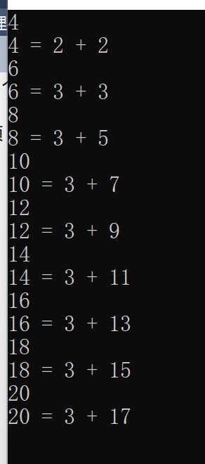 #include<stdio.h> int is_prime(int x); int main() { int i, n; while (scanf("%d", &n) != EOF) { for (i = 2; i <= n; i++) { if (!is_prime(i) || !is_prime(n - i))continue; printf("%d = %d + %d\n", n, i, n - i); break; } } return 0; } int is_prime(int x) { int i; for (i = 2; i *i<= x; i++) { if (x % i == 0) { return 0;} else { return 1; } } }