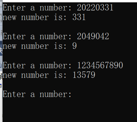 #include <stdio.h> #include <math.h> long func(long s); int main() { long s, t; printf("Enter a number: "); while (scanf("%ld", &s) != EOF) { t = func(s); // 函数调用 printf("new number is: %ld\n\n", t); printf("Enter a number: "); } return 0; } long func(long s) { long t = 0, t1 = 0; while (s > 0) { int tmp = s % 10; s /= 10; if (tmp % 2 == 1)t1 = t1 * 10 + tmp; } while (t1 > 0) { t = t * 10 + (t1 % 10); t1 /= 10; } return t; }