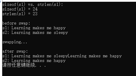 #include <stdio.h> #include <string.h> #include<stdlib.h> #define N 80 int main() { char s1[] = "Learning makes me happy"; char s2[] = "Learning makes me sleepy"; char tmp[N]; printf("sizeof(s1) vs. strlen(s1): \n"); printf("sizeof(s1) = %d\n", sizeof(s1)); printf("strlen(s1) = %d\n", strlen(s1)); printf("\nbefore swap: \n"); printf("s1: %s\n", s1); printf("s2: %s\n", s2); printf("\nswapping...\n"); strcpy(tmp, s1); strcpy(s1, s2); strcpy(s2, tmp); printf("\nafter swap: \n"); printf("s1: %s\n", s1); printf("s2: %s\n", s2); system("pause"); return 0; }