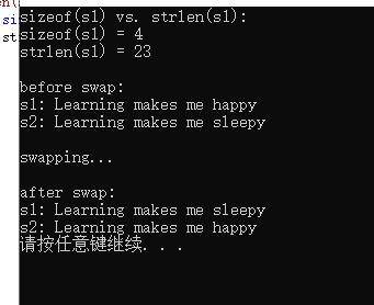 #include <stdio.h> #include <string.h> #include<stdlib.h> #define N 80 int main() { char *s1 = "Learning makes me happy"; char *s2 = "Learning makes me sleepy"; char *tmp; printf("sizeof(s1) vs. strlen(s1): \n"); printf("sizeof(s1) = %d\n", sizeof(s1)); printf("strlen(s1) = %d\n", strlen(s1)); printf("\nbefore swap: \n"); printf("s1: %s\n", s1); printf("s2: %s\n", s2); printf("\nswapping...\n"); tmp = s1; s1 = s2; s2 = tmp; printf("\nafter swap: \n"); printf("s1: %s\n", s1); printf("s2: %s\n", s2); system("pause"); return 0; }