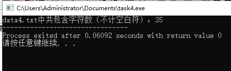 #include <stdio.h> #include <string.h> #include<stdlib.h> int main() { int t = 0; char s[80]; FILE *fp; fp = fopen("C://Users//Administrator//Desktop//实验7//实验7数据文件及部分代码//data4.txt","r"); if(fp == NULL) { printf("fail to open the file\n"); system("pause"); return 1; } while(!feof(fp)) { fscanf(fp,"%s",s); t += strlen(s); } printf("data4.txt中共包含字符数(不计空白符):%d",t); fclose(fp); system("pause"); return 0; }
