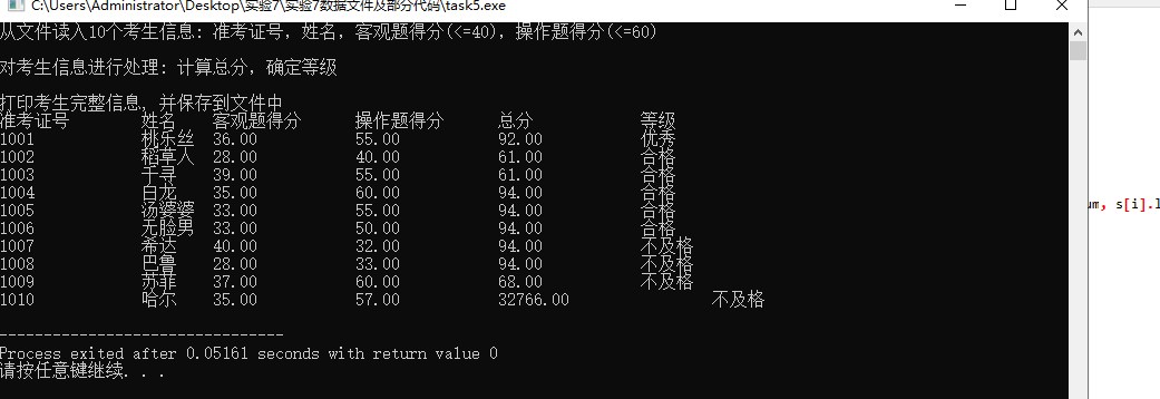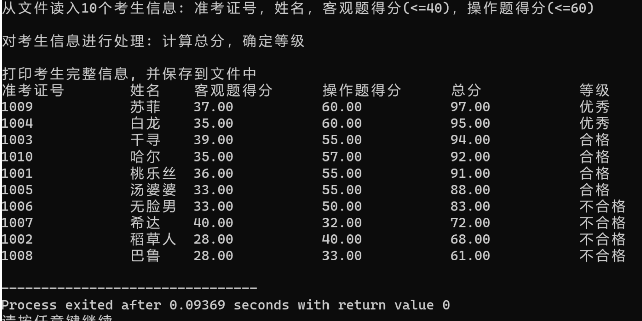 #include <stdio.h> #include <string.h> #include <cstdlib> #define N 10 typedef struct { long int id; char name[20]; float objective; // 客观题得分 float subjective; // 操作题得分 float sum; char level[10]; } STU; // 函数声明 void input(STU s[], int n); void output(STU s[], int n); void process(STU s[], int n); int main() { STU stu[N]; printf("从文件读入%d个考生信息: 准考证号,姓名,客观题得分(<=40),操作题得分(<=60)\n", N); input(stu, N); printf("\n对考生信息进行处理: 计算总分,确定等级\n"); process(stu, N); printf("\n打印考生完整信息, 并保存到文件中"); output(stu, N); return 0; } // 从文本文件examinee.txt读入考生信息:准考证号,姓名,客观题得分,操作题得分 void input(STU s[], int n) { int i; FILE *fin; fin = fopen("C://Users//郝遥//Documents//Tencent Files//1062663622//FileRecv//MobileFile//examinee.txt", "r"); if (fin == NULL) { printf("fail to open file\n"); exit(0); } while (!feof(fin)) { for (i = 0; i < n; i++) fscanf(fin, "%ld %s %f %f", &s[i].id, s[i].name,&s[i].objective, &s[i].subjective); } fclose(fin); } // 输出考生完整信息: 准考证号,姓名,客观题得分,操作题得分,总分,等级 // 不仅输出到屏幕上,还写到文本文件result.txt中 void output(STU s[], int n) { FILE *fout; int i; // 输出到屏幕 printf("\n"); printf("准考证号\t姓名\t客观题得分\t操作题得分\t总分\t\t等级\n"); for (i = 0; i < n; i++) printf("%ld\t\t%s\t%.2f\t\t%.2f\t\t%.2f\t\t%s\n", s[i].id,s[i].name, s[i].objective, s[i].subjective, s[i].sum, s[i].level); // 保存到文件 fout = fopen("result.txt", "w"); if (!fout) { printf("fail to open or create result.txt\n"); exit(0); } fprintf(fout, "准考证号\t\t姓名\t客观题得分\t操作题得分\t总分\t\t等级\n"); for (i = 0; i < n; i++) fprintf(fout, "%ld\t\t%s\t%.2f\t\t%.2f\t\t%.2f\t\t%s\n", s[i].id,s[i].name, s[i].objective, s[i].subjective, s[i].sum, s[i].level); fclose(fout); } // 对考生信息进行处理:计算总分,排序,确定等级 void process(STU s[], int n) { int i, j; for(i = 0;i < n; i++) { s[i].sum = s[i].objective + s[i].subjective; } for(i = 0;i < n; i++) { for(j = 0;j < n - i - 1; j++) { if(s[j].sum < s[j + 1].sum) { STU t; t = s[j]; s[j] = s[j + 1]; s[j + 1] = t; } } } for(i = 0;i < n; i++) { if(i <= n * 0.1) strcpy(s[i].level, "优秀"); else if(i <= n * 0.5) strcpy(s[i].level, "合格"); else strcpy(s[i].level, "不合格"); } }