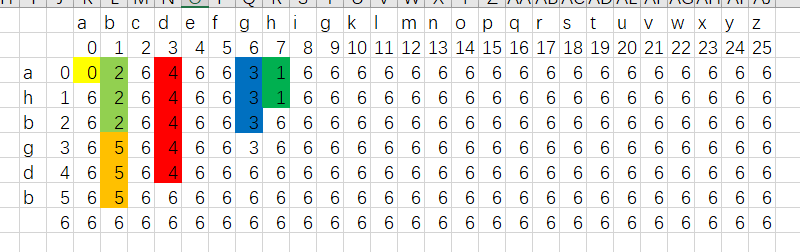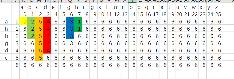我们的数组的size,根据demo的情况,是一个 7 x 26的数组, 多出来的一行,是给那些匹配不上的字符用的!