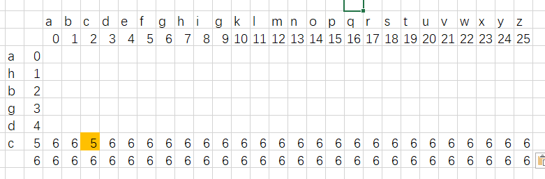 所以 行列都为c的 就会变成当前的index 5 (为什么是5呢,这是有用的!它保存了该字符第一次出现的位置), 别的地方都照抄下面一行的
