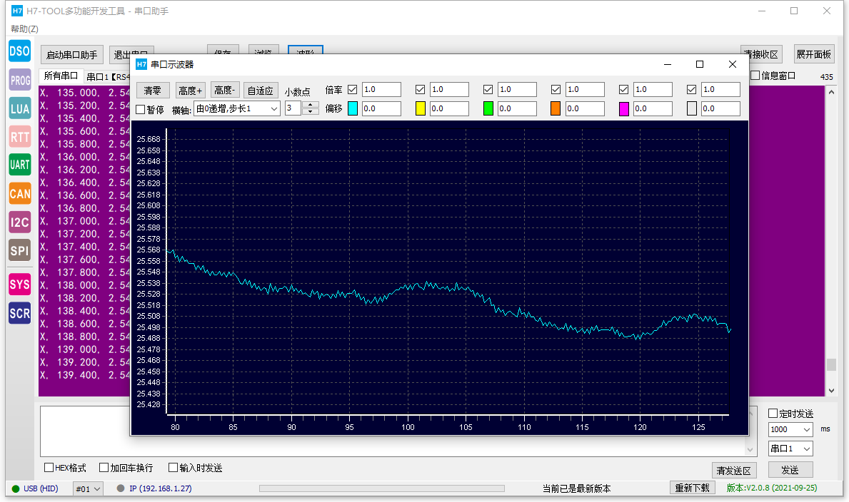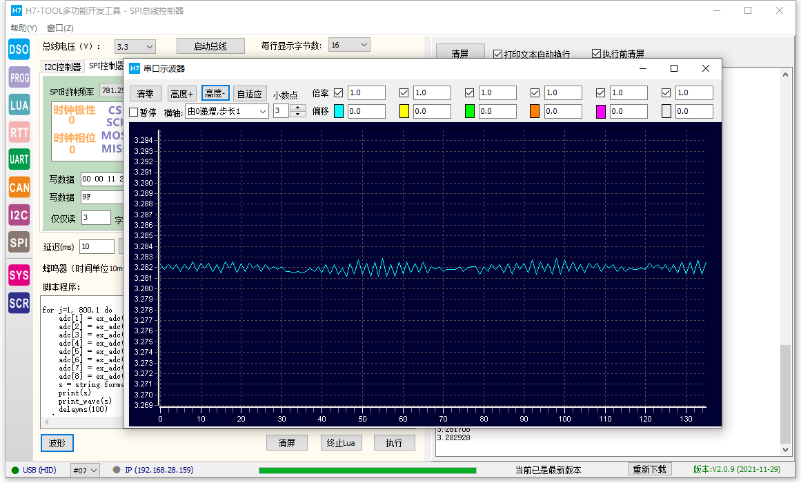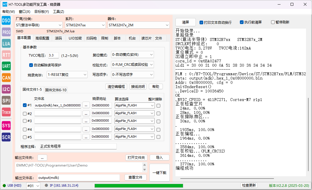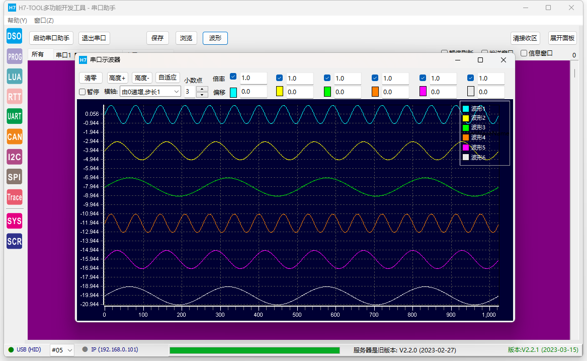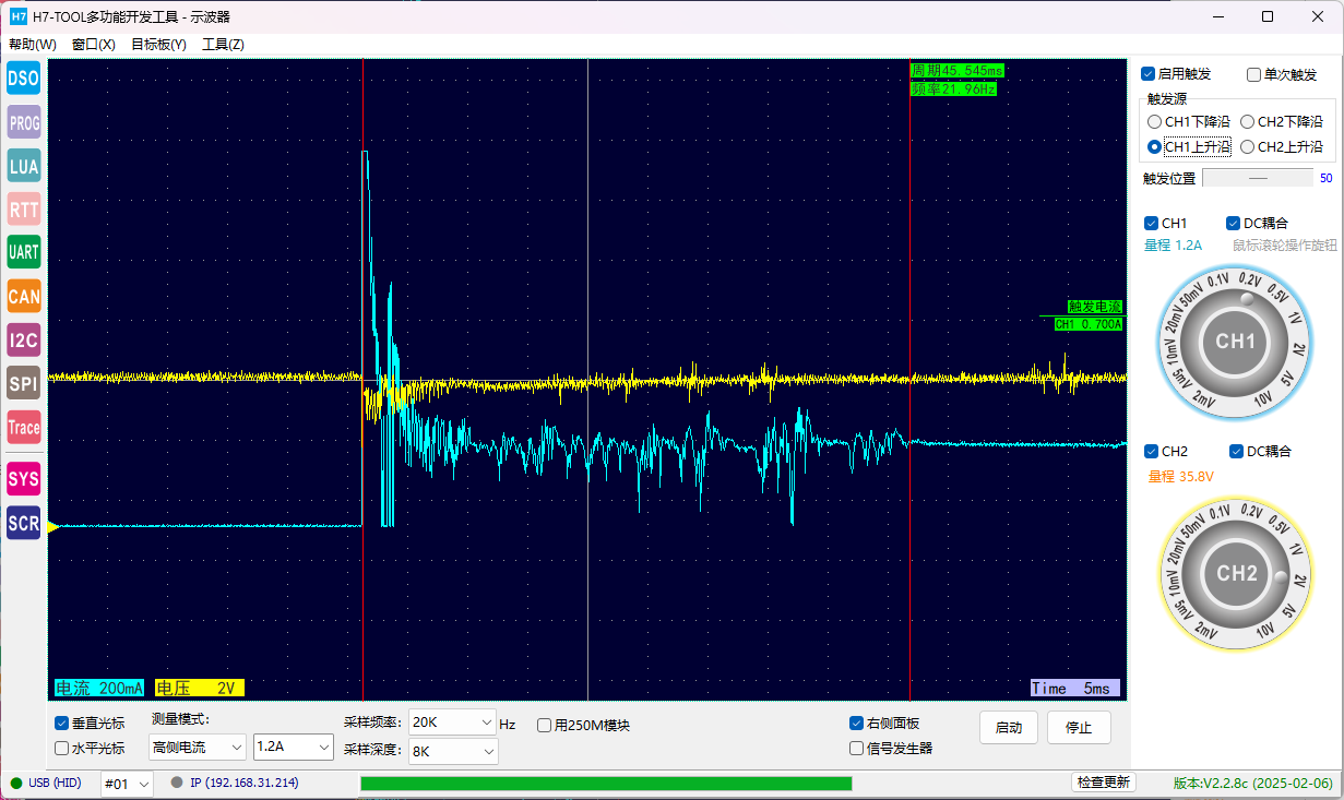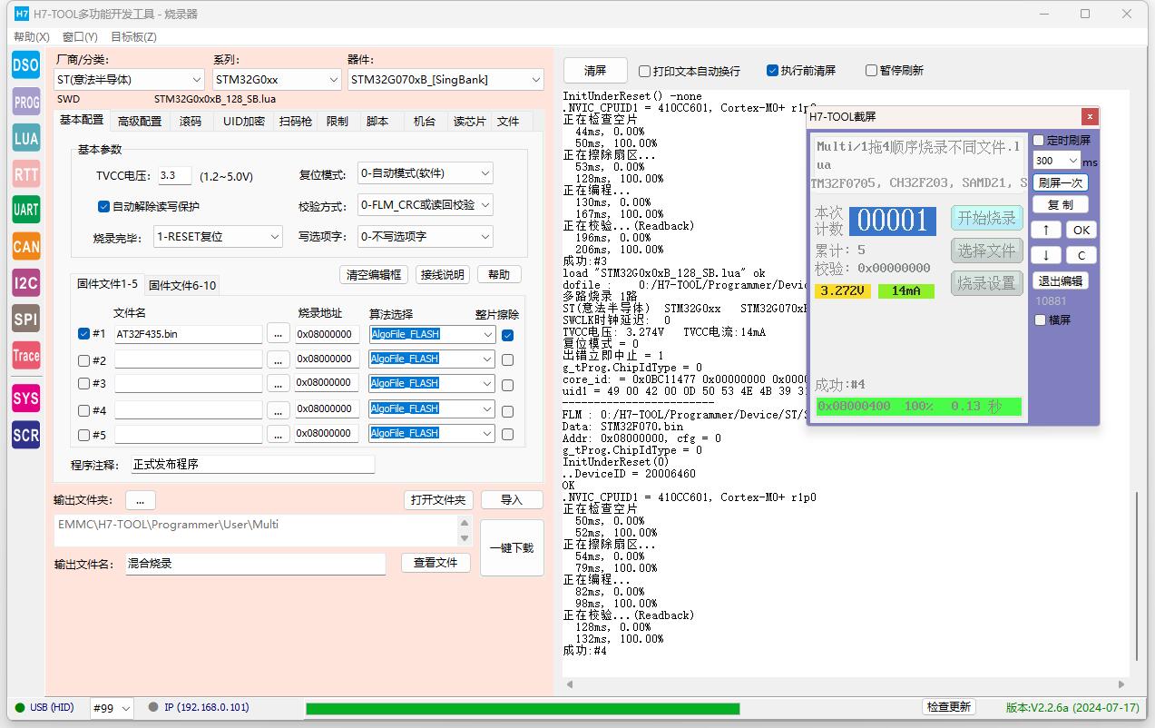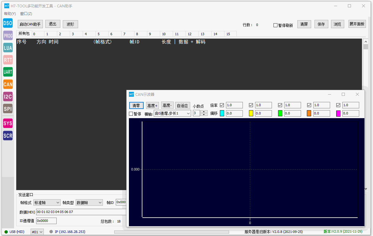 1、H7-TOOL固件2.29发布,高速在线仿真,1拖4和1拖16脱机烧录,数控电源,LUA小程序,RTOS Trace,CMSIS-SVD解析,截图功能,SPI主从控制器,I2C主从控制器,Scope波形,硬件异常黑盒子,RTT Viewer,CAN/CANFD助手,两路高速HID免驱虚拟串口助手,Moddbus主从,CANopen/J1939/OBD15765/UDS解析,250M示波器,信号发生器,4-20mA电流输入输出等全部高速USB免驱一条龙,同时支持板载WiFi和以太网的局域网和外网控制。