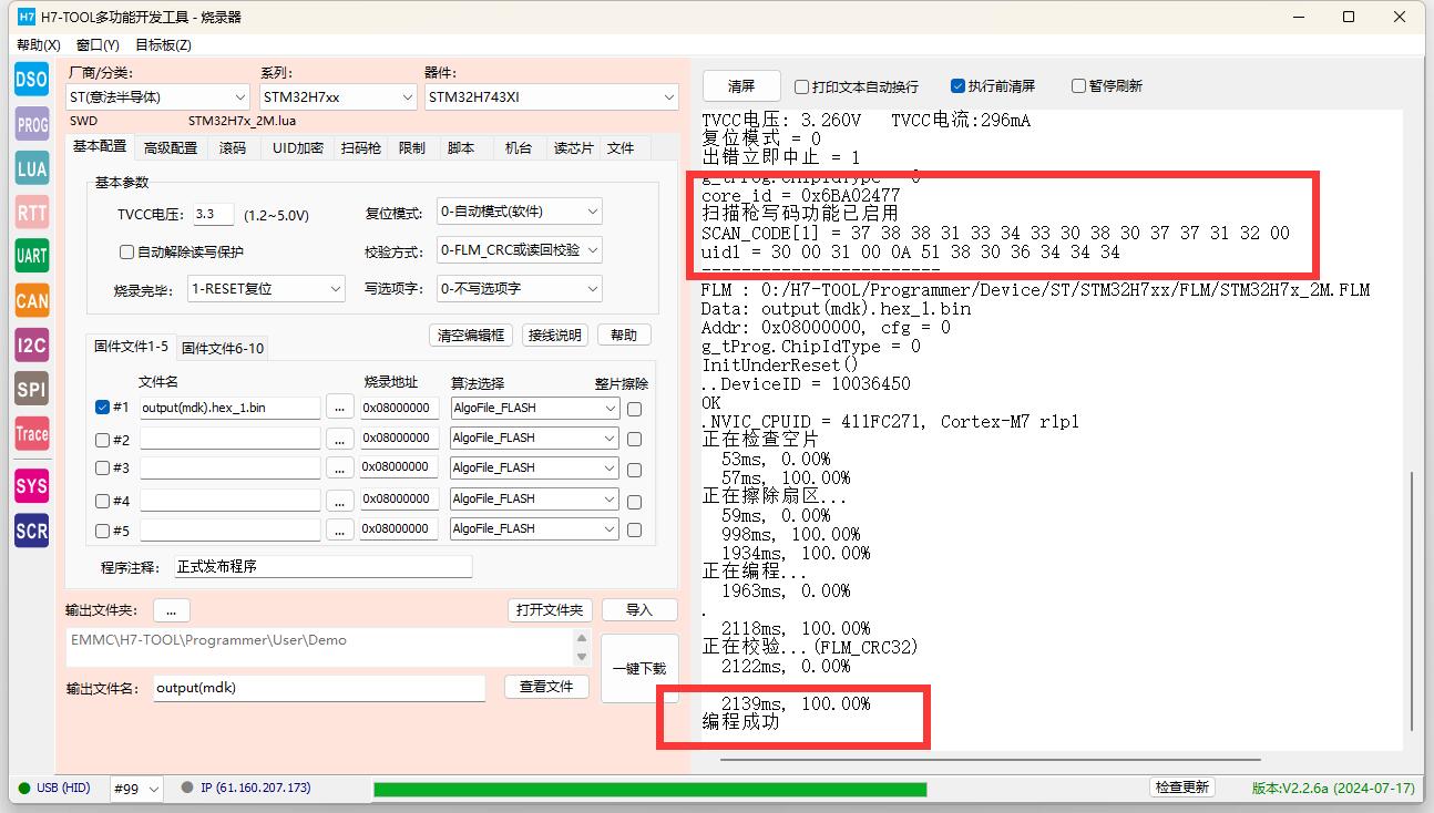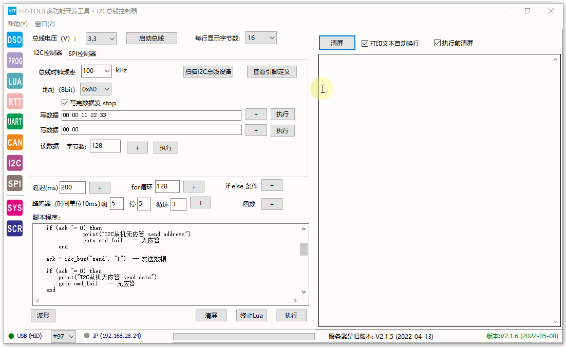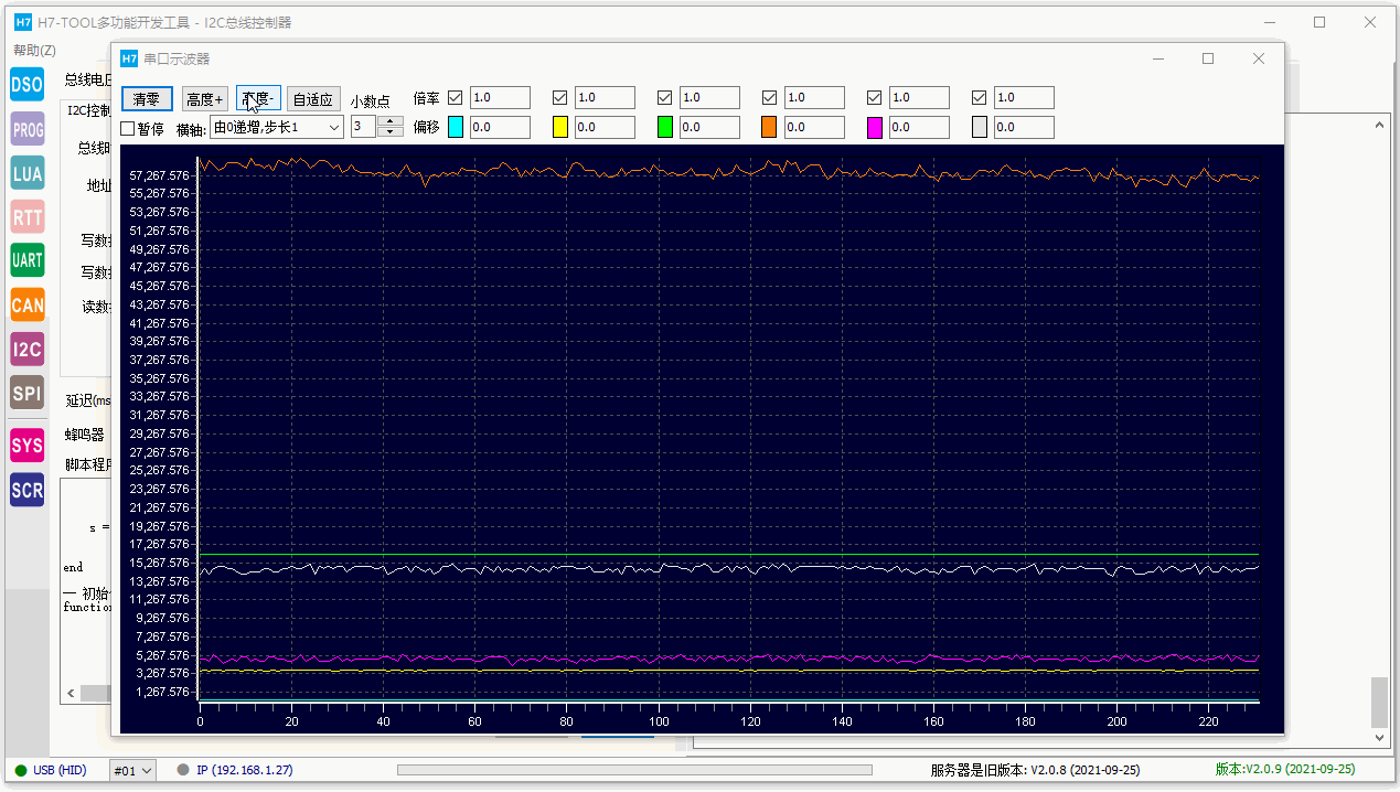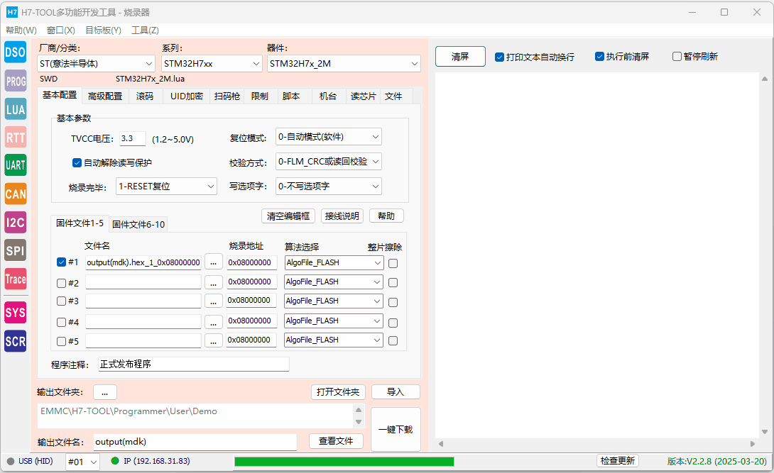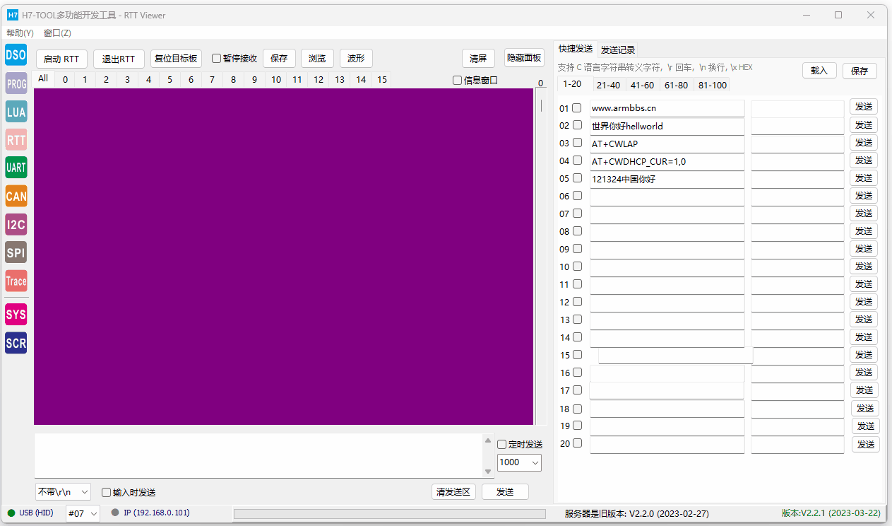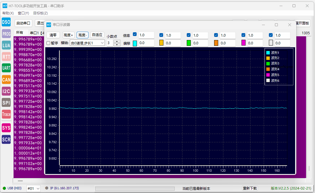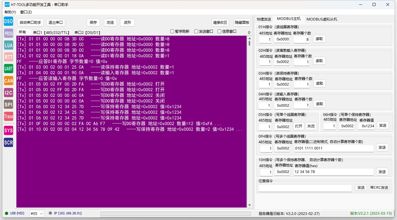 1、H7-TOOL固件2.29发布,高速在线仿真,1拖4和1拖16脱机烧录,数控电源,LUA小程序,RTOS Trace,CMSIS-SVD解析,截图功能,SPI主从控制器,I2C主从控制器,Scope波形,硬件异常黑盒子,RTT Viewer,CAN/CANFD助手,两路高速HID免驱虚拟串口助手,Moddbus主从,CANopen/J1939/OBD15765/UDS解析,250M示波器,信号发生器,4-20mA电流输入输出等全部高速USB免驱一条龙,同时支持板载WiFi和以太网的局域网和外网控制。