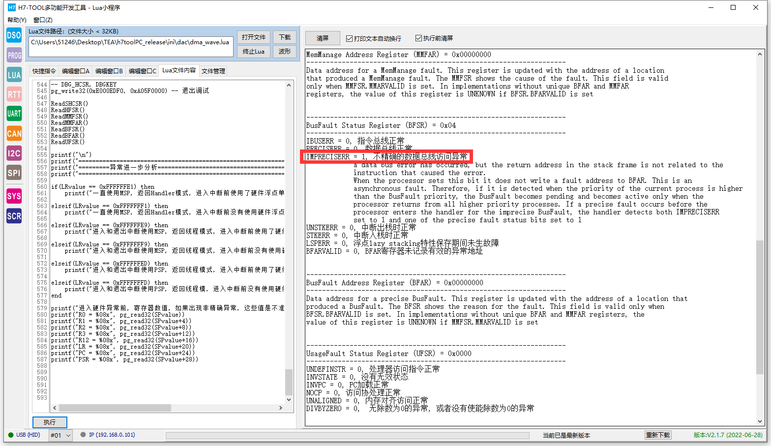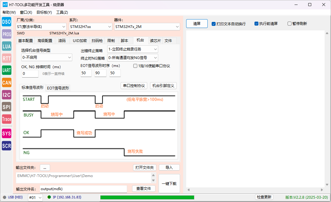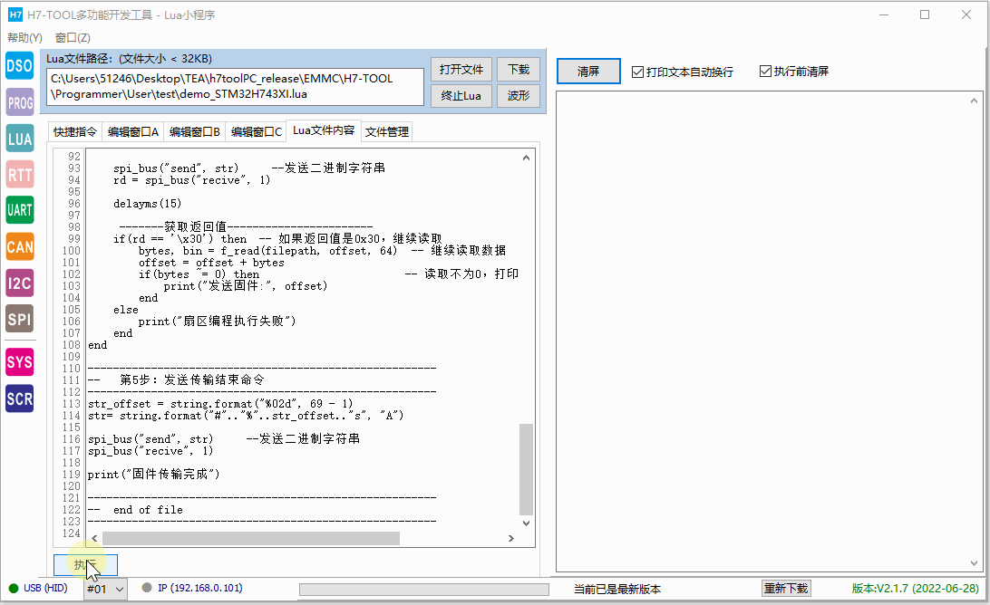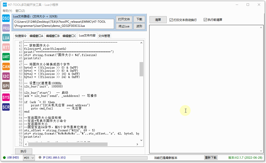 LUA脚本的好处是用户可以根据自己注册的一批API(当前TOOL已经提供了几百个函数供大家使用),实现各种小程序,不再限制Flash里面已经下载的程序,就跟手机安装APP差不多,所以在H7-TOOL里面被广泛使用,支持在线调试运行,支持离线运行。