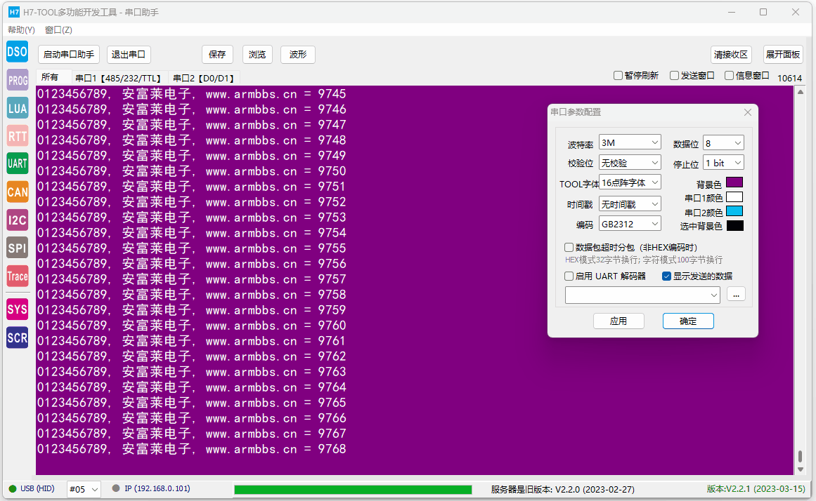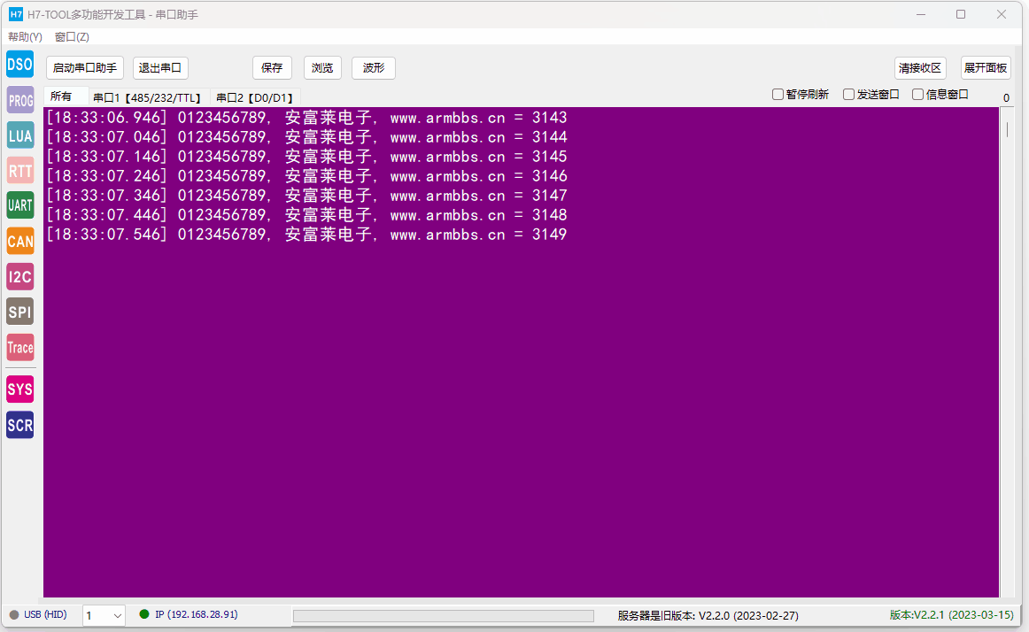 - 支持2路串口数据显示, 第1路: 232RX, 485, TTTLRX 第2路: D1 URX 。