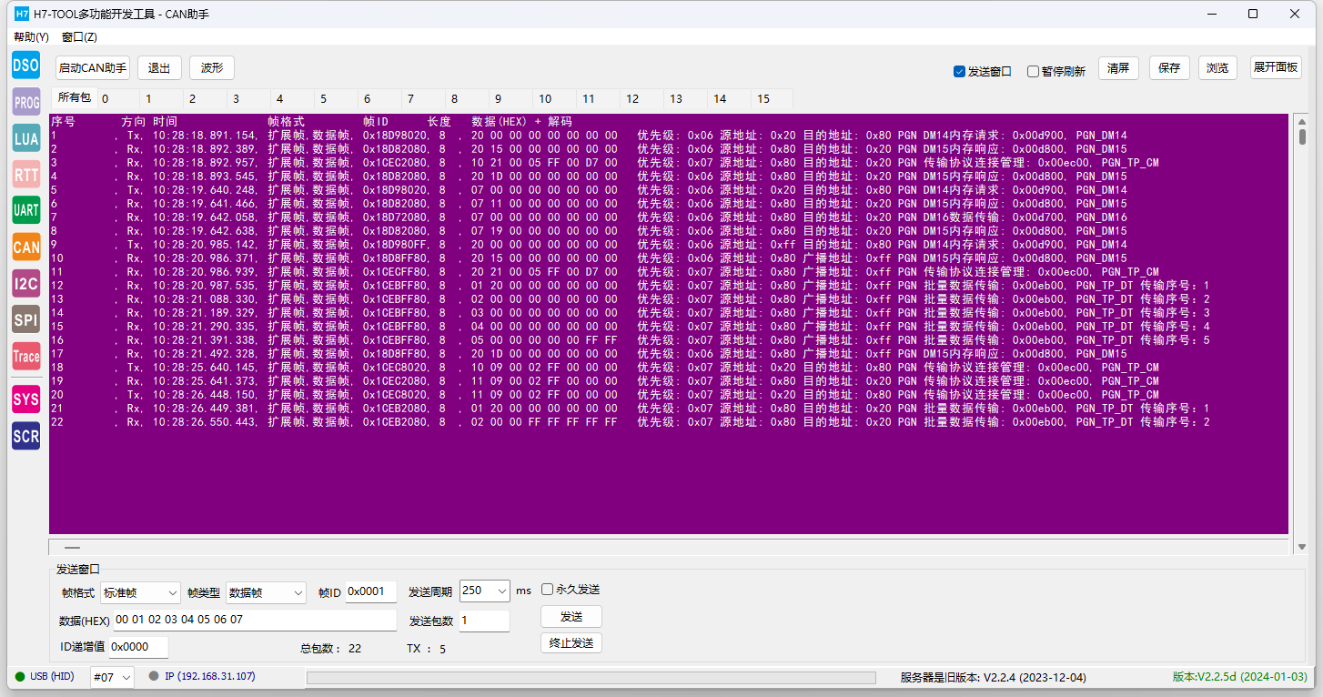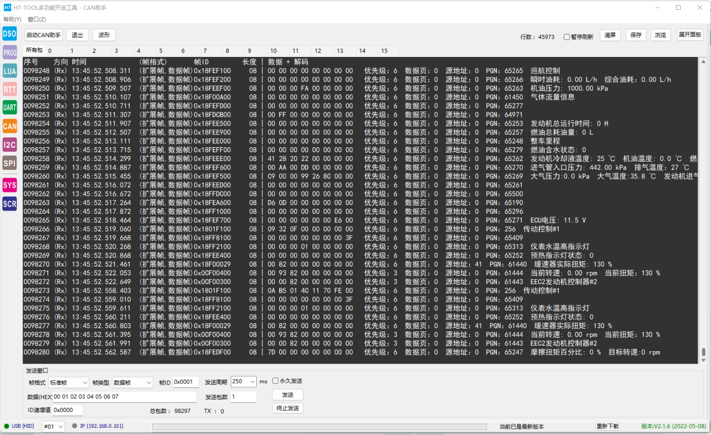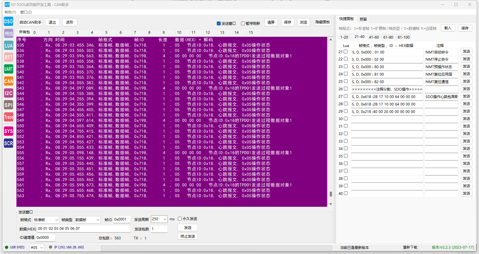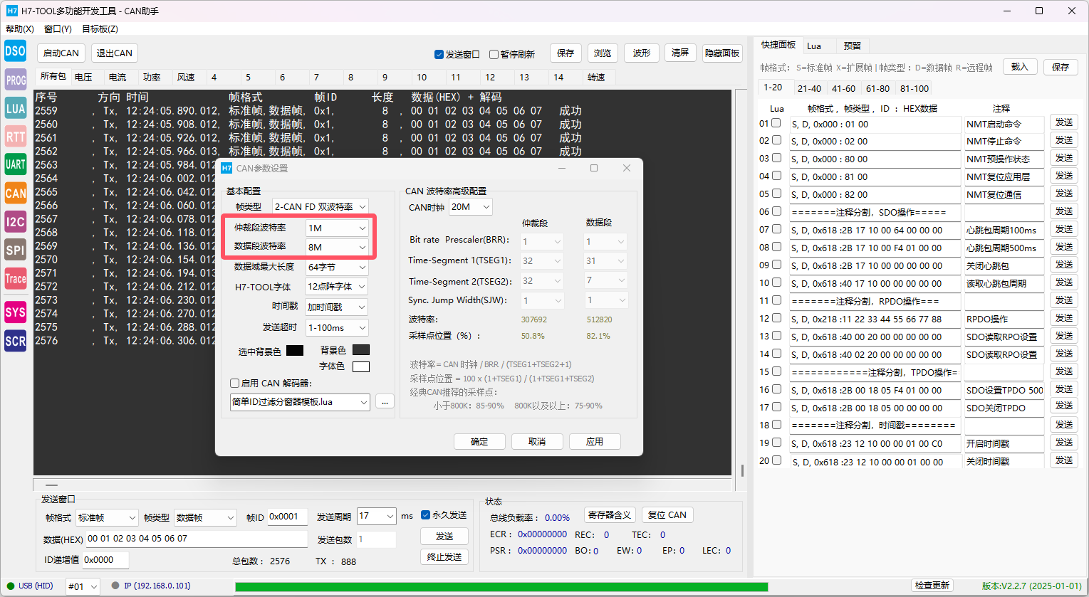 H7-TOOL的CAN/CANFD助手使用说明V2.2,支持8Mbps通信,支持CANopen,J1939,OBD15765,UDS解析(2025-08-16)