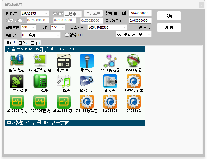 2、支持RGB接口屏和总线接口屏方式,对于总线接口方式,比如使用STM32的FSMC总线外接ili9488,RA8875都是没问题的。并且也支持FSMC总线方式外接OLED屏读取。
