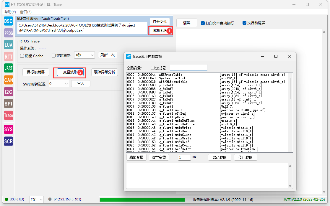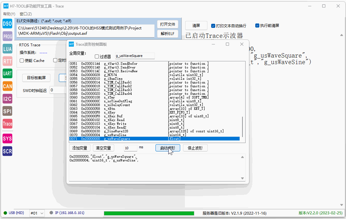 Scope波形,支持导入elf,axf,out文件来解析工程的全局变量,含结构体变量成员