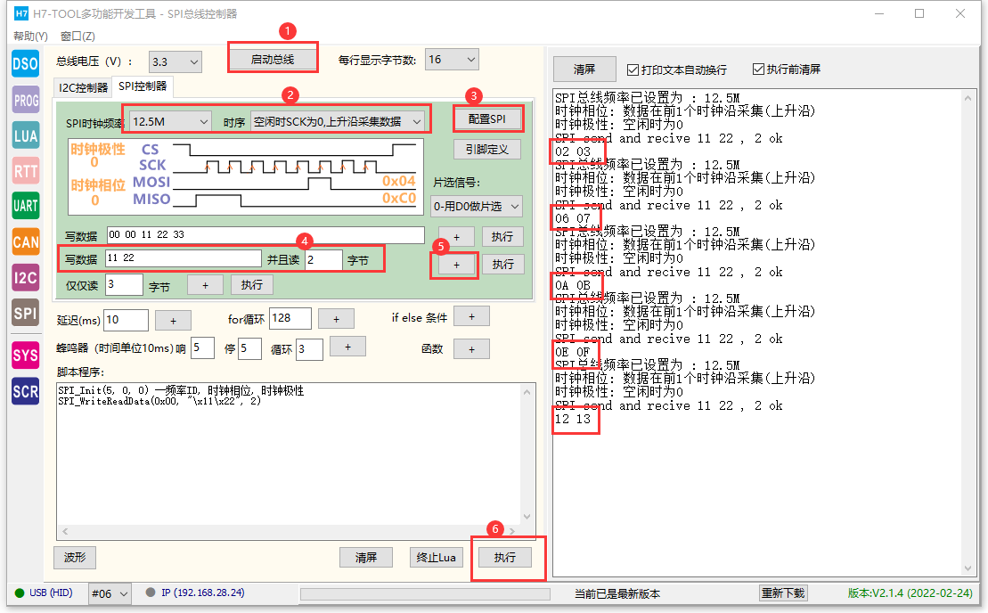 (3)H7-TOOL的SPI控制器主从机操作说明,20cm杜邦线接线方式,SPI全双工25MHz通信速度