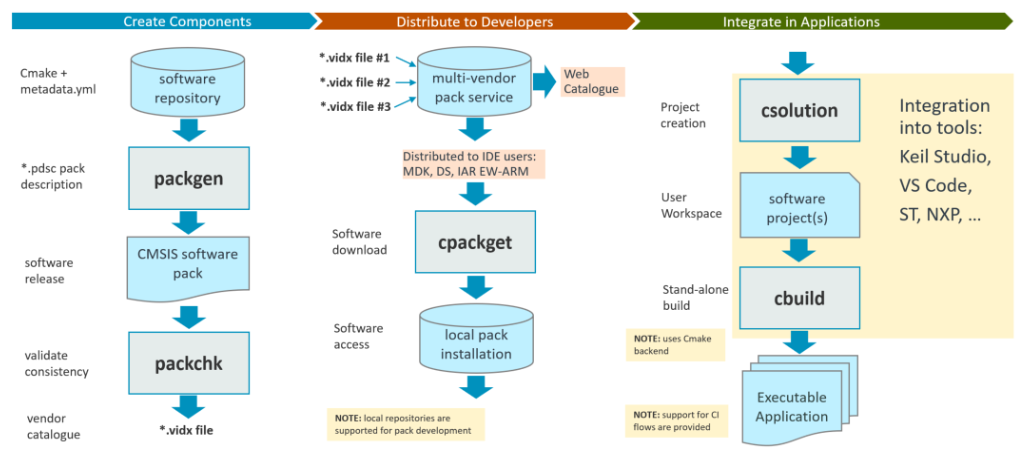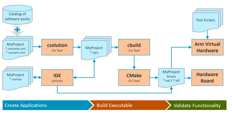 (3)CMSIS-Toolbox,主要作用是创建,维护,分发和安装软件包,并且可以使用各种编译工具的接口构建项目。更像是要给统一各种编译器开发方式的工具。