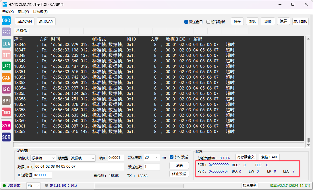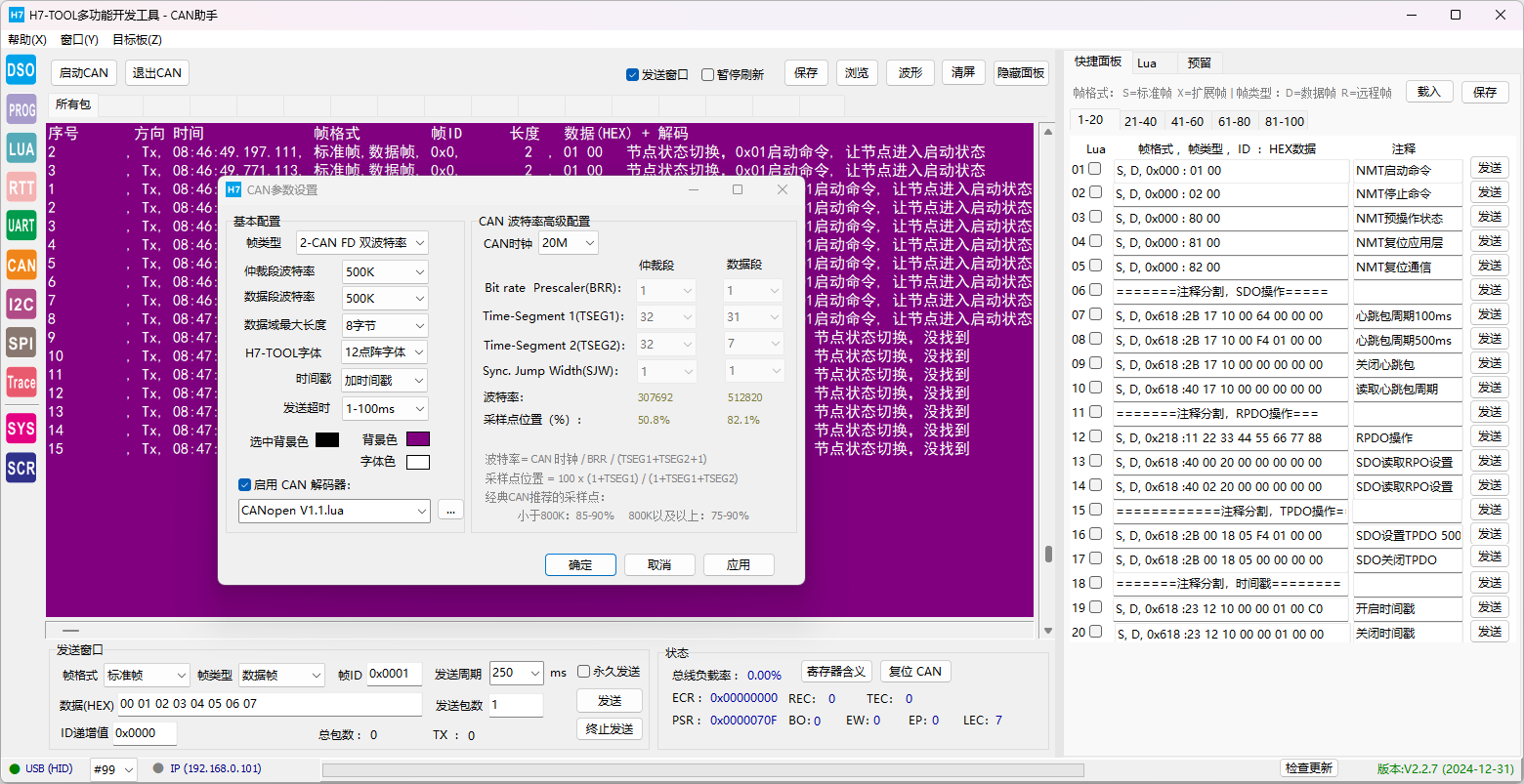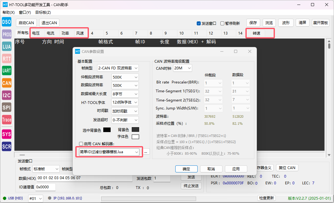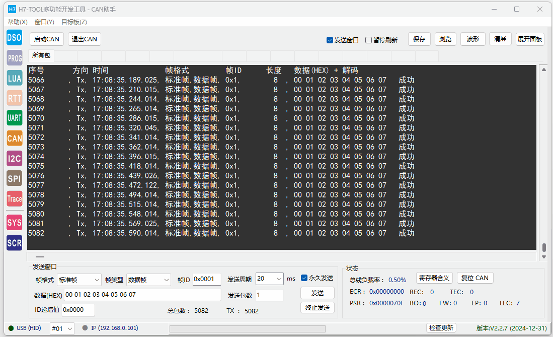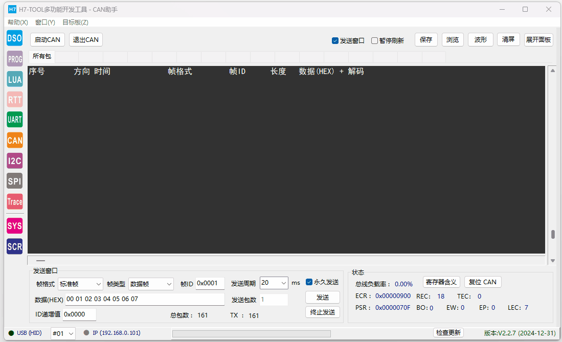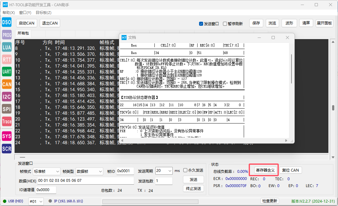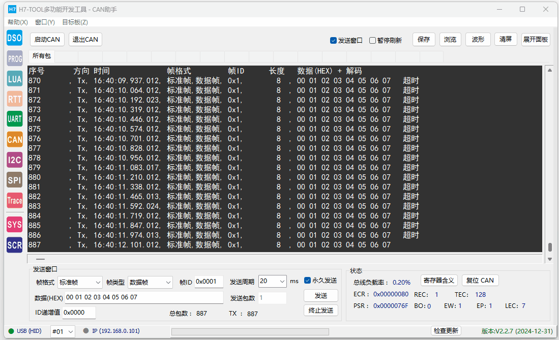 H7-TOOL固件2.27发布,新增加40多款芯片脱机烧录,含多款车轨芯片,发布LUA API手册,CAN助手增加负载率,错误状态信息检测