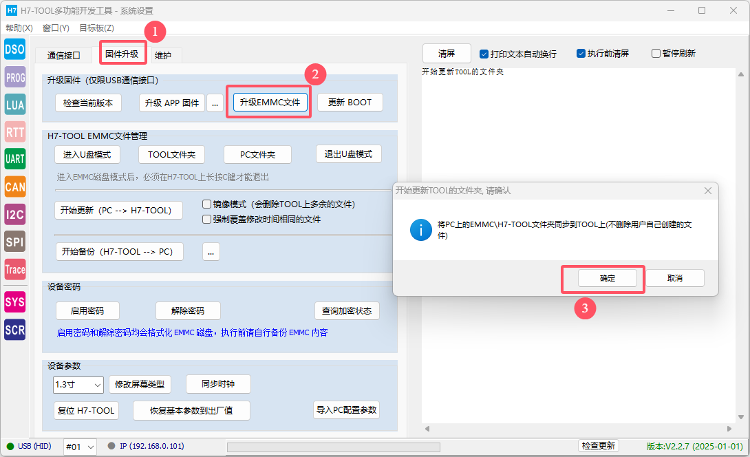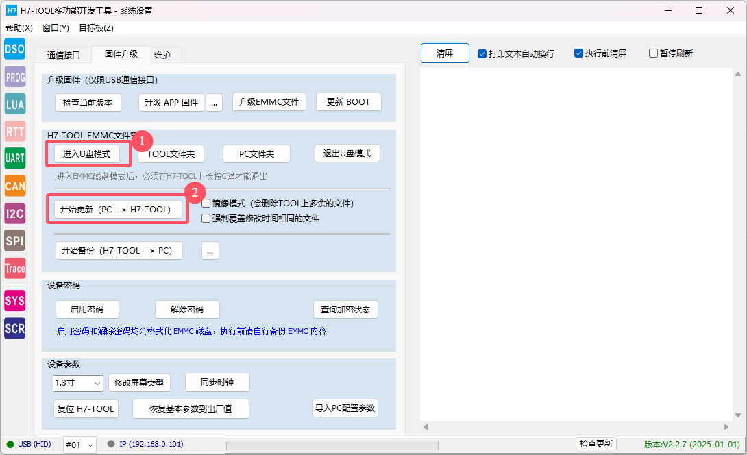 注:如果更新APP失败,从TOOL端拔掉USB线,旧版TOOL长按S键,新版TOOL长按OK键,插入USB线,3秒后松手,正常会看到电脑端有个虚拟U盘。然后拖拽上位机软件包路径h7toolPC_release\EMMC\H7-TOOL\Firmware里面的APP固件到虚拟U盘,待传输完毕后,TOOL会自动重新启动。